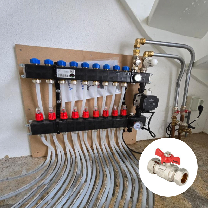 De aansluiting van de verdeler op de Cv-installatie dient voorbereid te worden binnen een straal van 1 meter van de verdeler middels een 22mm knel afsluiter. Voor de elektrische aansluiting van de verdeler dient de opdrachtgever zelf te zorgen voor een geaard stopcontact binnen een straal van 50 cm van de verdeler.
